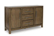 Define your dining room with reliable function and style. This dining server sits comfortably at the intersection of modern lodge and farmhouse aesthetics. Charming architectural elements and a light brown glazed finish reflect your warm and welcoming disposition. Even with its poise, it remains practical, serving up plenty of storage space in its dual cabinets and spacious drawers.